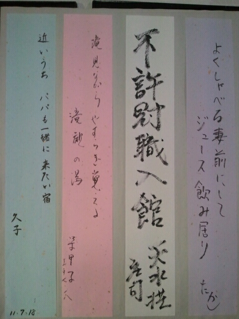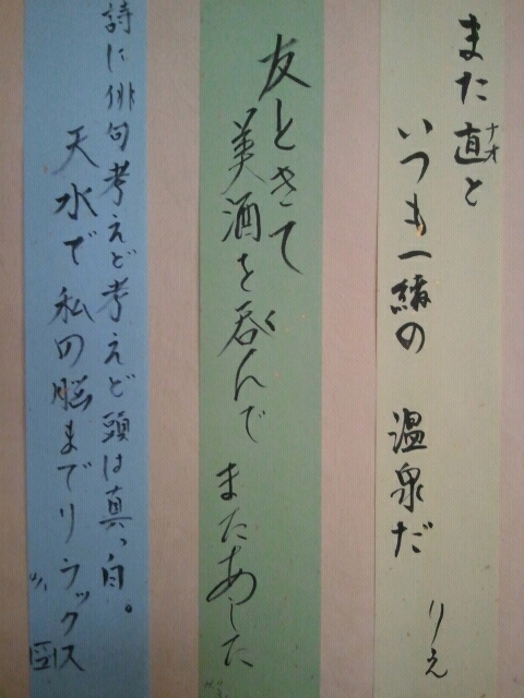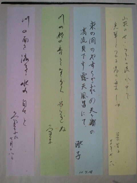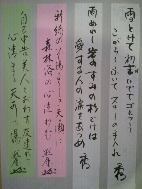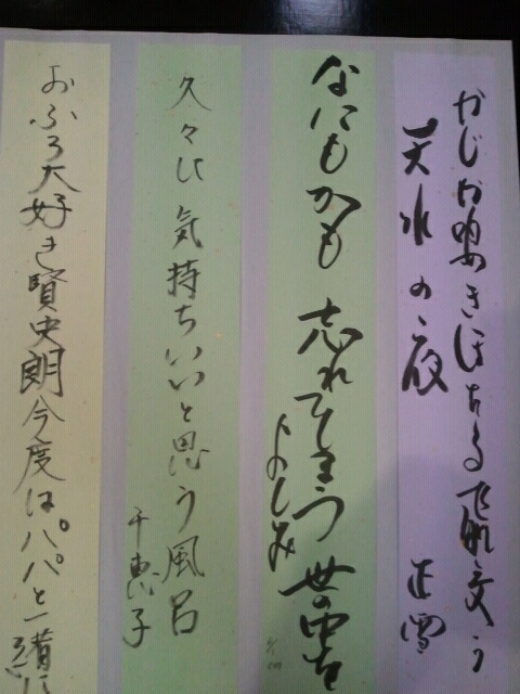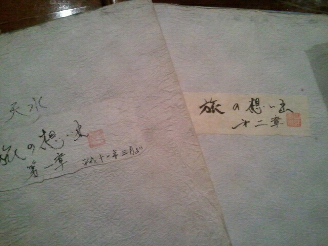 朝晩は寒いくらいでした。 天水の森は 秋の虫たちが 静けさのなかで鳴いています。 森のラウンジの一角に お客様の旅の 想い出を綴った短冊を 置いております。 平成11年の3月から始めて 11冊目になりました。 皆様の想い出を拝見すると ありがたいお言葉や 微笑ましい句が綴られています。 このブログで 少しずつご紹介させて頂きます。 天水の森は絵心、歌心を 刺激されるそうです。 どうぞ『一句』 詠んでみてはいかがでしょうか(^.^) 山荘天水のホームページへ 山荘天水のホームページへ |