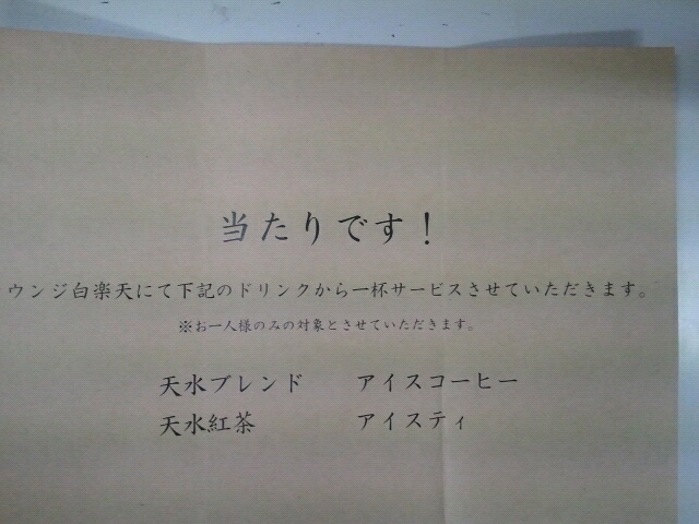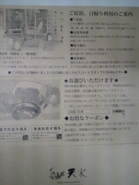 午後6時を過ぎると こんなに薄暗くなります。 9月30日は十五夜です。 月見風呂が楽しみですね。 ところで 先日からお配りしている 館内のご案内のチラシに 『当たりクジ』を追加しました。 『当たり』のチラシを お受け取りのお客様には コーヒー又は紅茶を一杯 サービスさせて頂きます。 どうぞお楽しみに! さて、今回の旅の想い出は 皆さま、ほのぼのとした 旅の想い出を 書いてくださっています。 ありがたいです(^.^) 山荘天水のホームページへ 山荘天水のホームページへ |