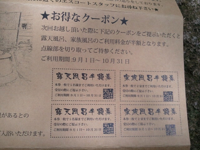 天水の森では ひぐらしやコオロギが 鳴き始めました。 朝晩の涼しさに秋がきたと 勘違いしているのでしょう。 さて、この度 若いスタッフのアイデアで ご来館のお客様に 館内施設のご案内パンフレットを お配りすることになりました。 このパンフレットには お得なクーポンを お付けしております。 また、石門のところに ご自由にお取り頂けるように パンフレットを置きました。 ご不明な点は 全てのスタッフが エスコートいたしますので お気軽にお声かけくださいませ。 心よりお待ちしております。 山荘天水のホームページへ 山荘天水のホームページへ |