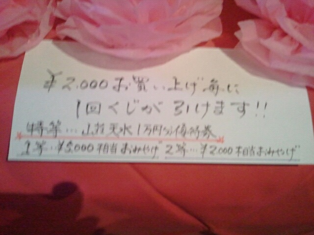 福引きを始めました! 2000円お買い上げごとに ガラガラを一回まわして頂きます。 特賞は一万円分の天水宿泊ご優待券 一等は五千円相当の商品など 空くじなしです。 さっそく宿泊優待券が 当選されたお客様が いらっしゃいました! 森の売店で 運試しはいかがでしょうか(^.^) 山荘天水のホームページへ 山荘天水のホームページへ |