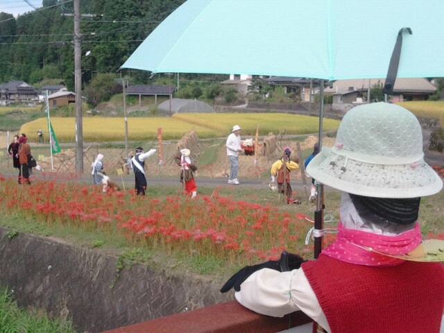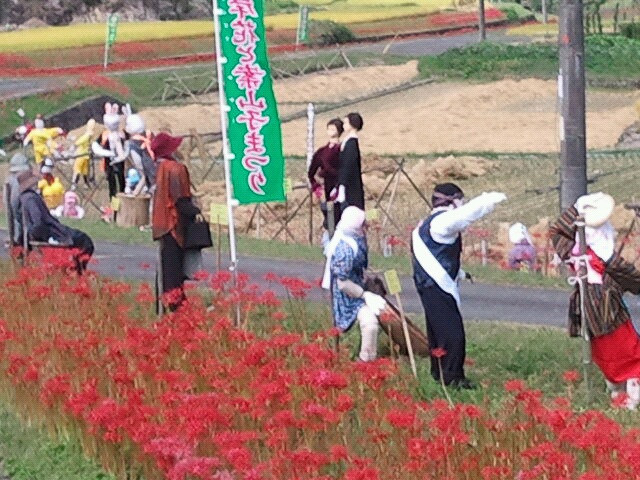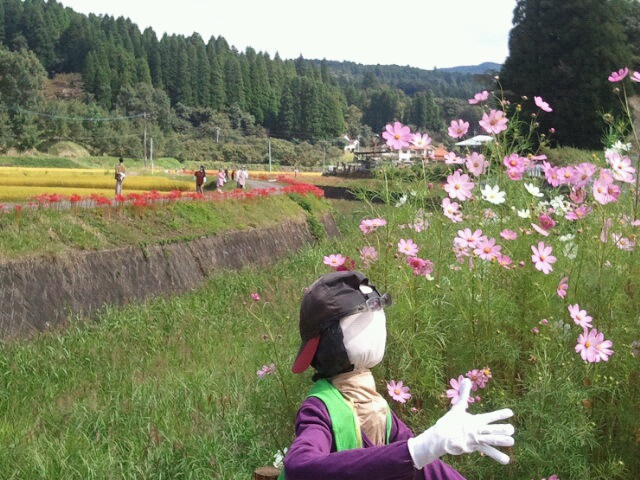 何やら人だかりを見つけました。 車を降りて近づくと たくさんの案山子と彼岸花が 田んぼの畦道に並んでいました。 声をかけようと近づいたら この人も案山子だったんです。 森の緑と稲穂の黄色 彼岸花の赤と空の青が とても綺麗な空間でした! 天水から車で5分ほどのところです。 彼岸花と案山子まつりは 10月末まで行われているそうです! 彼岸花は今が見頃ですよ(^.^) 山荘天水のホームページへ 山荘天水のホームページへ |